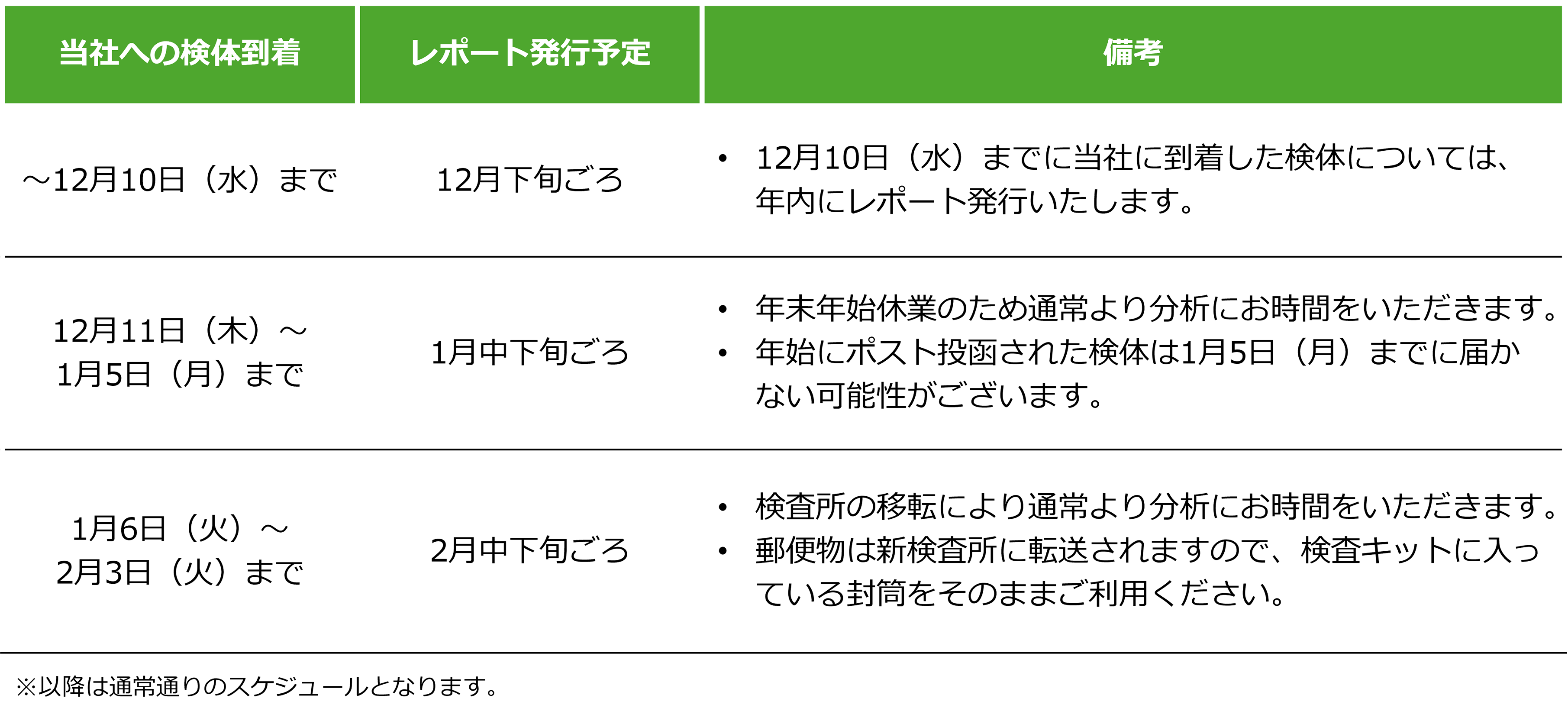 【重要】年末年始の検査キット発送およびレポート発行スケジュールについて
